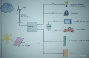 P.V. panels and a windmill provide for power, while high efficient appliances and low voltage lights minimize the amount required.