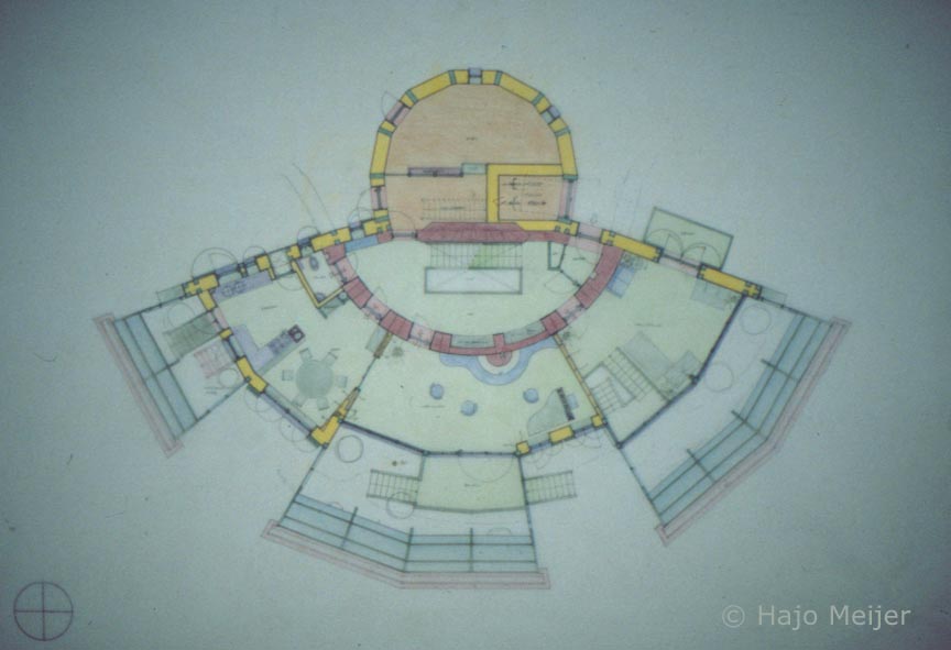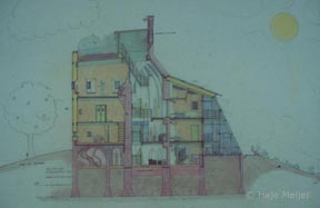 The north part of the house has a root cellar on the 1st, a stable and bike storage on the 2nd, hay storage on the 3rd and a recreational space on the 4th level, with a roof garden on top.