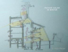 Heating is provided by the sun and several masonry heaters of very high efficiency, needing to burn only2 hours a day.